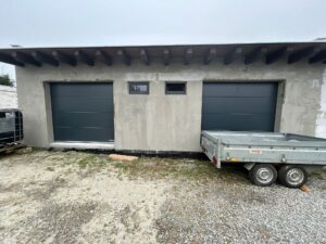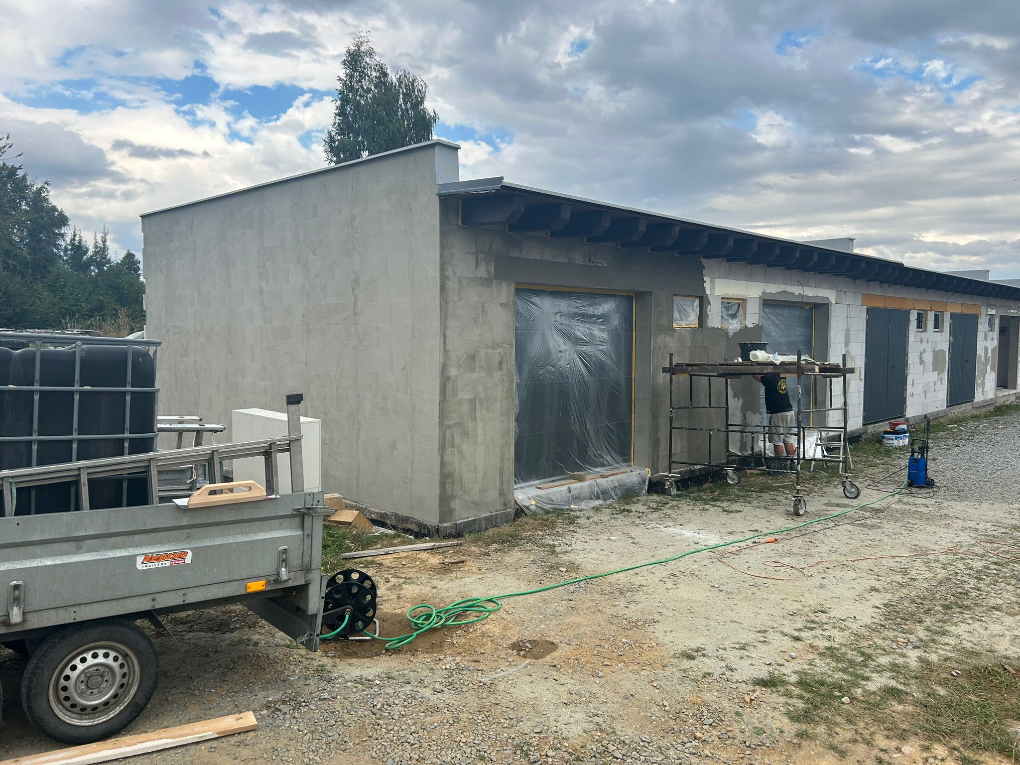Na garáži byla provedena příprava fasády – natažení lepidla s perlinkou pro zpevnění povrchu a vyrovnání nerovností.
