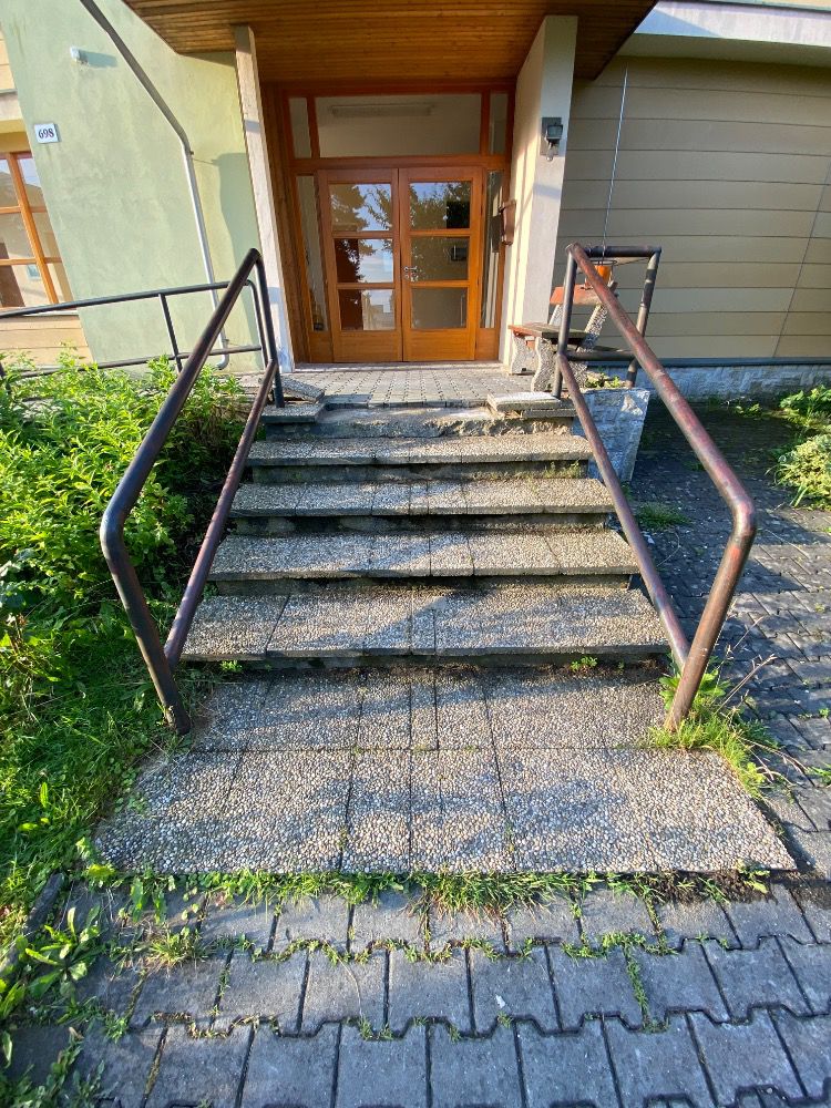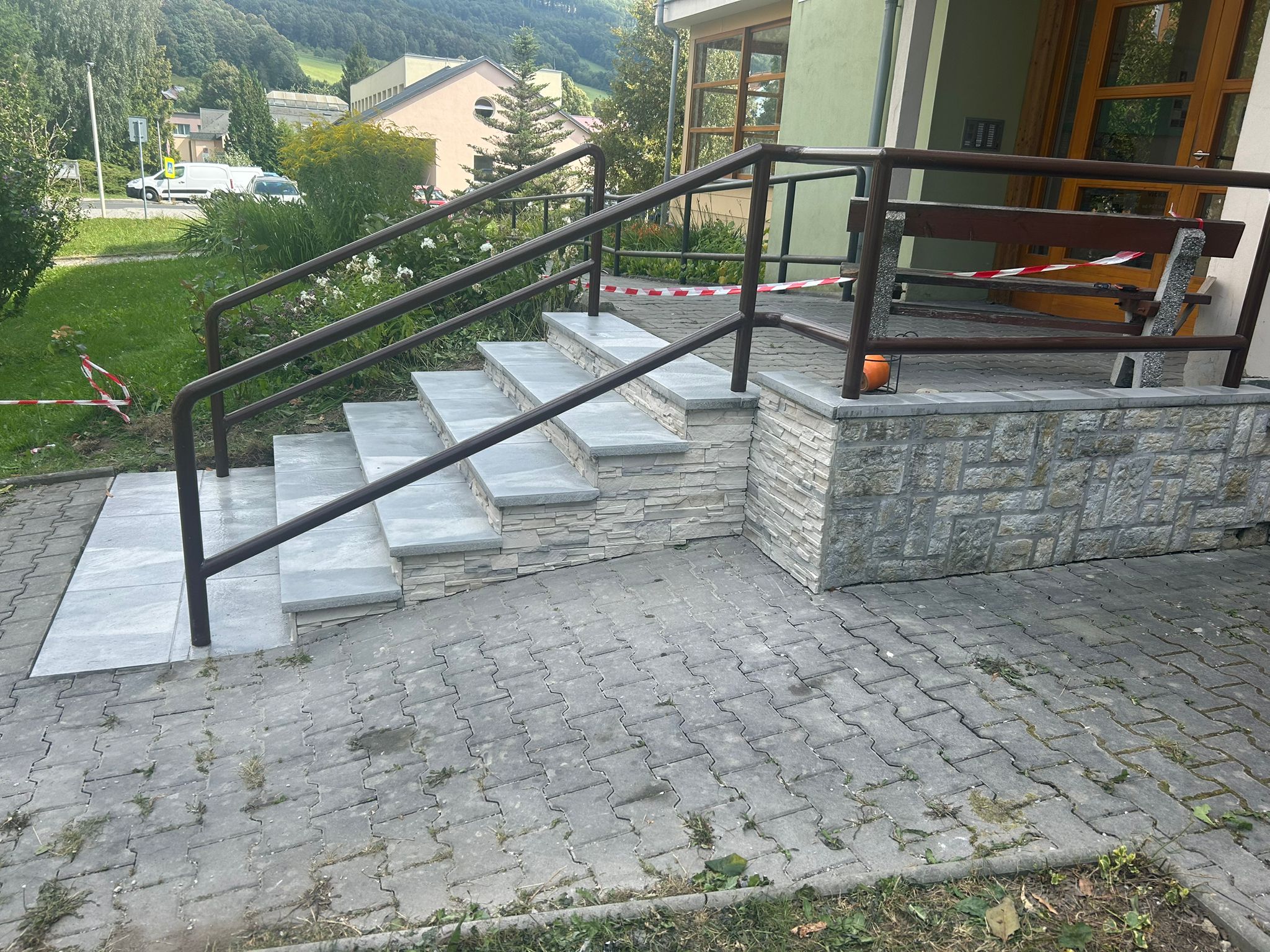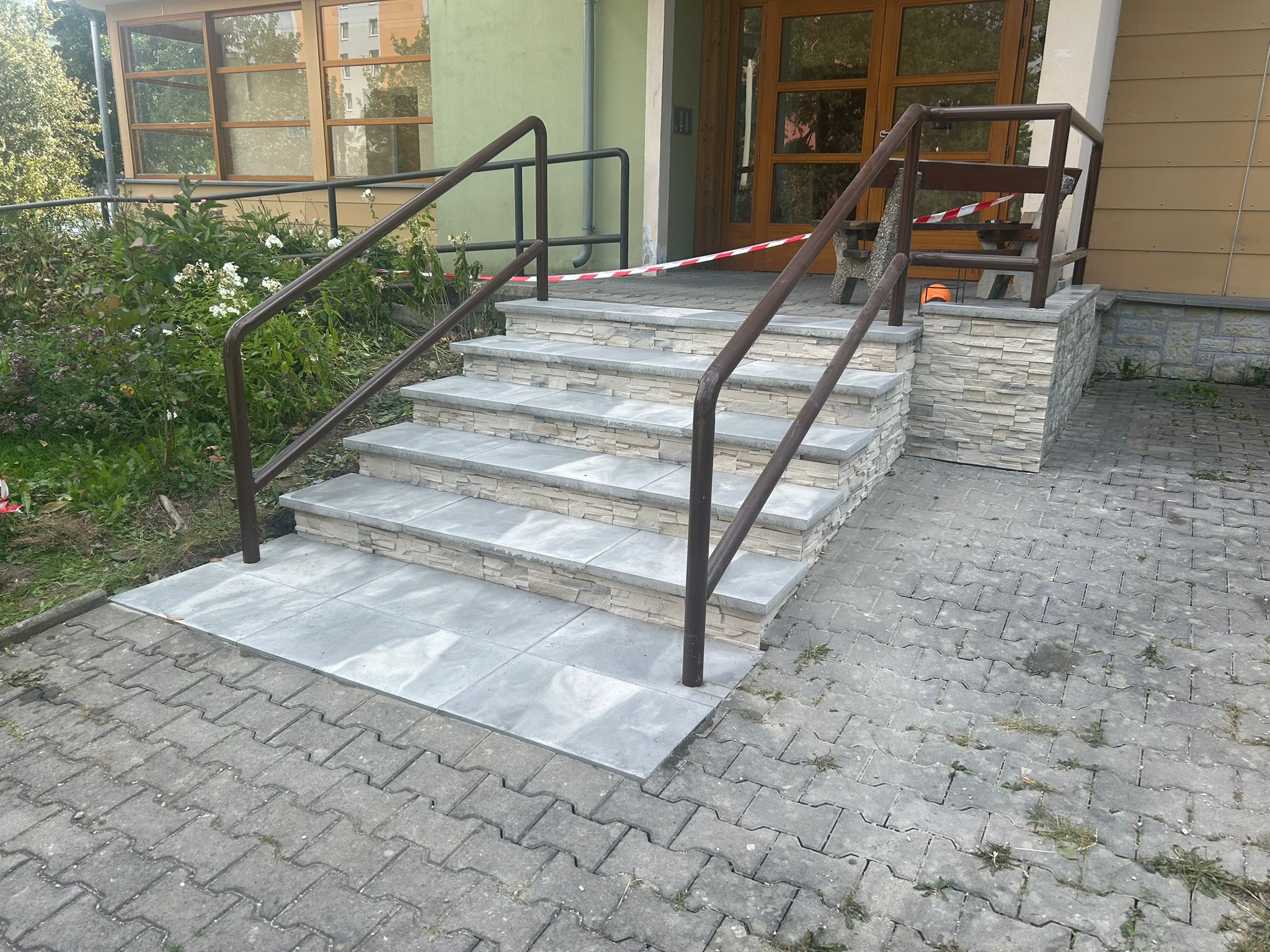 Výsledkem jsou odolné, esteticky sjednocené schody s moderním vzhledem, které zajišťují bezpečný a pohodlný vstup do budovy.