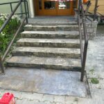 Původní betonové schodiště bylo ve špatném stavu – popraskané stupně, uvolněné obklady a opotřebované zábradlí.