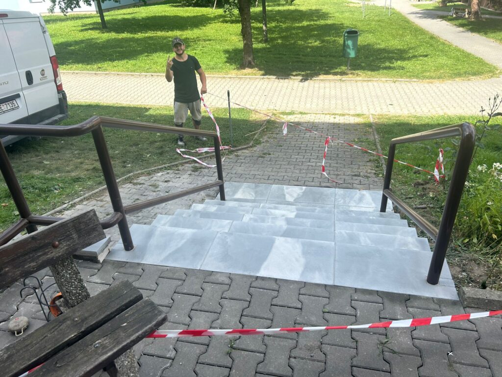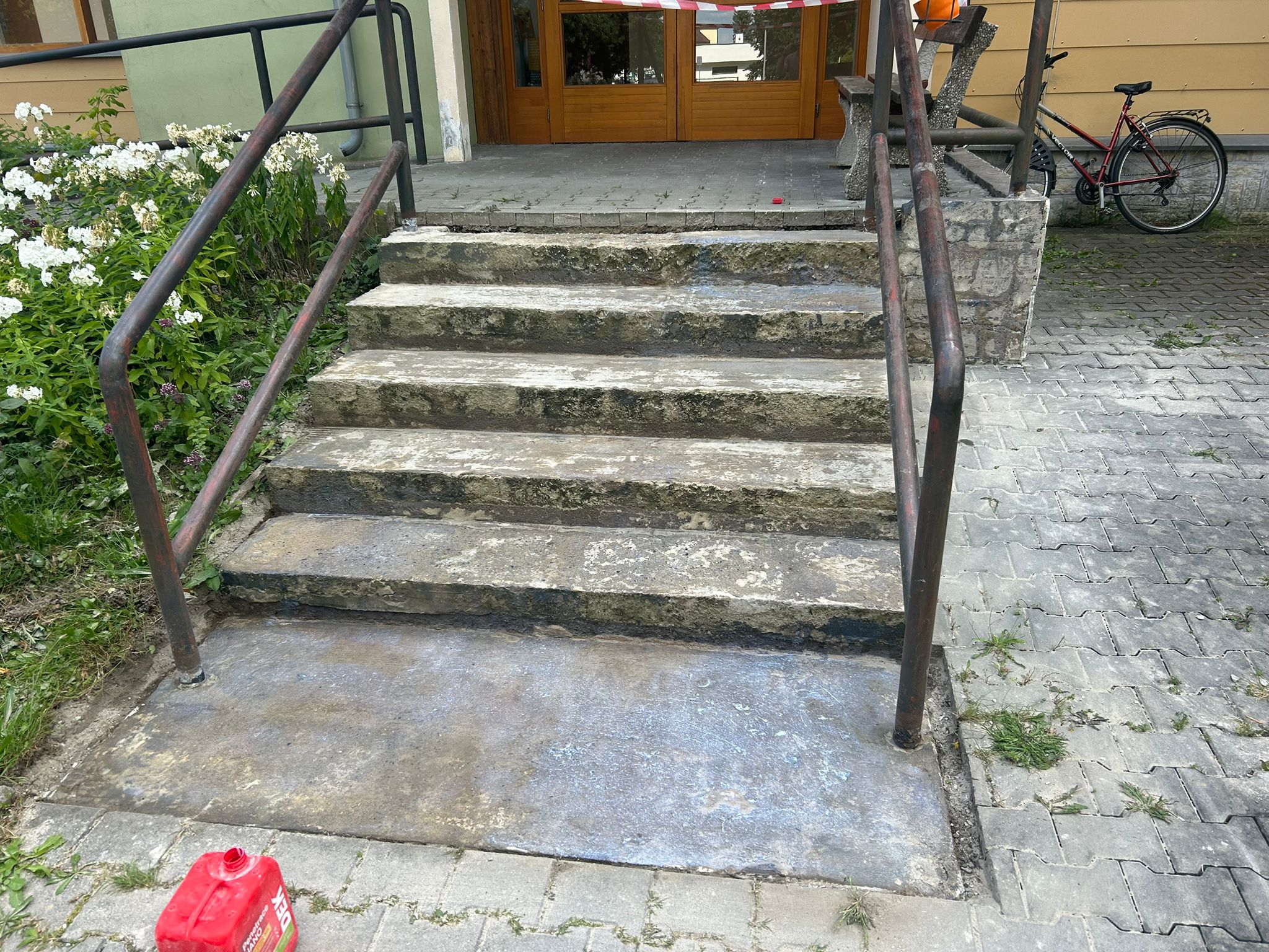 V rámci opravy jsme provedli kompletní opravu povrchu schodů, obložení novou mrazuvzdornou dlažbou a betonovým obkladem bočních stěn. Zábradlí bylo očištěno, opraveno a natřeno novým nátěrem.