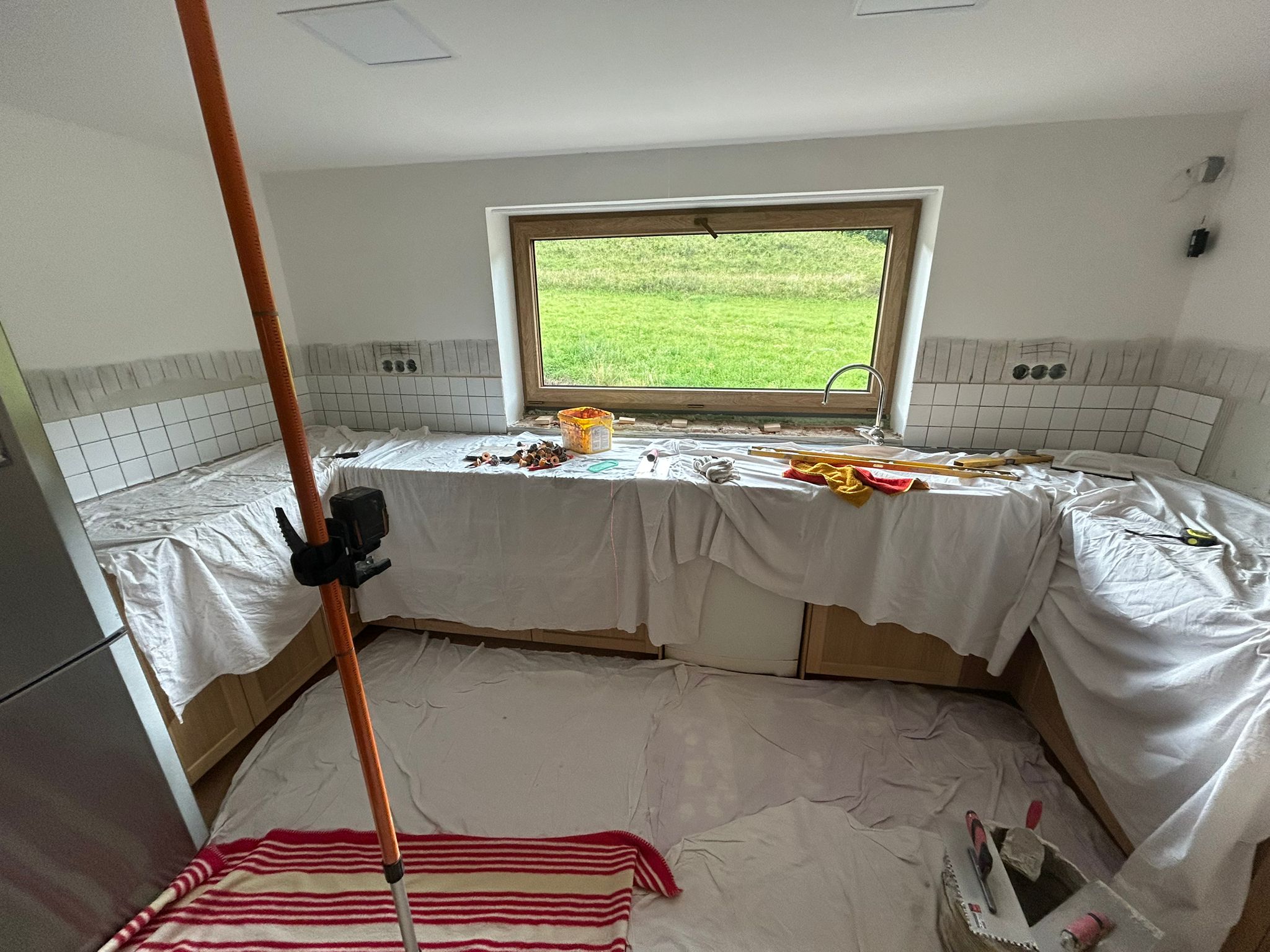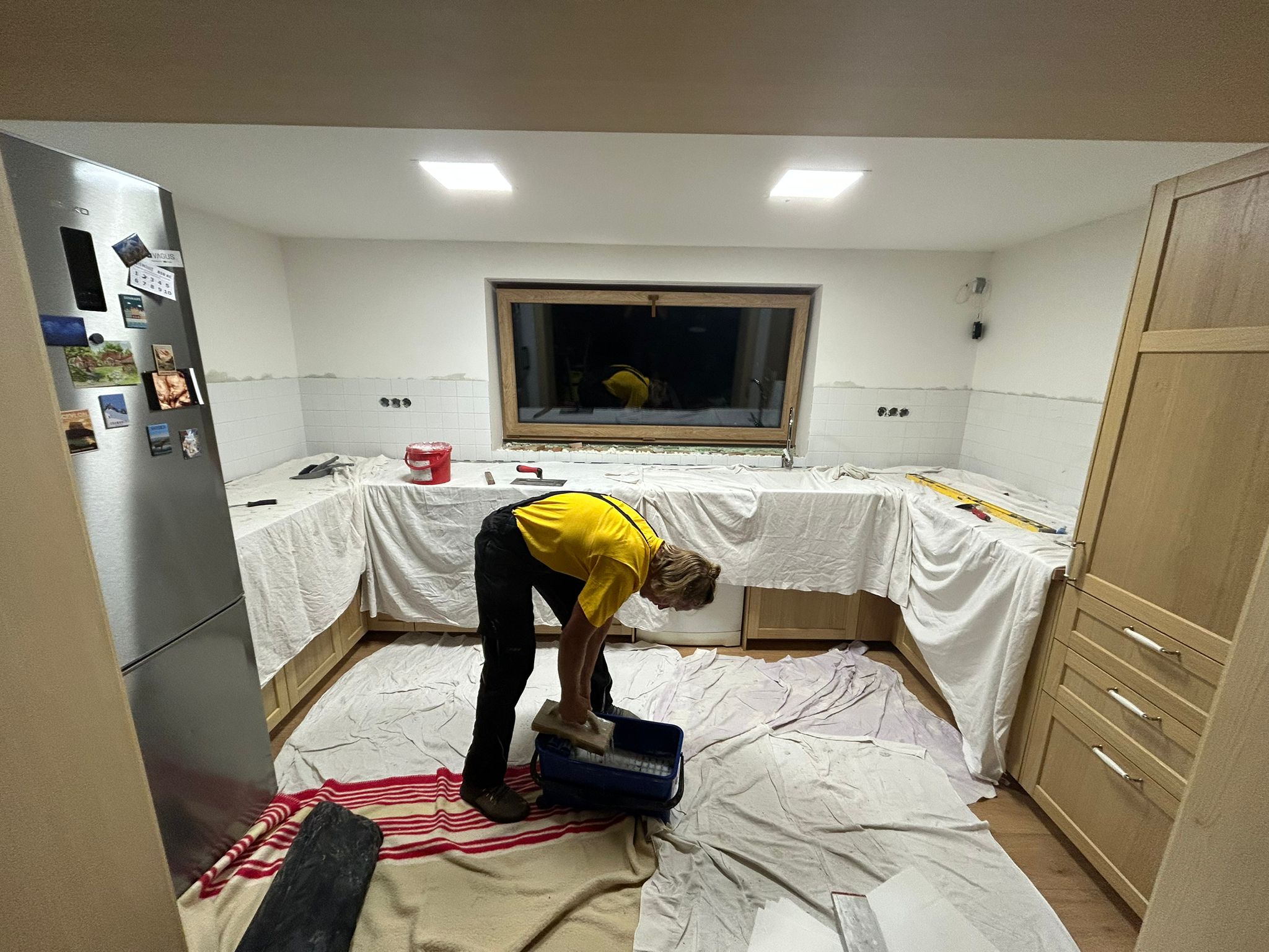 Při práci byl kladen důraz na přesné lícování, čisté spáry a pečlivé zakončení kolem zásuvek a rohů. Výsledkem je svěží, světlá a snadno udržovatelná plocha, která kuchyni dodává čistý a elegantní vzhled.