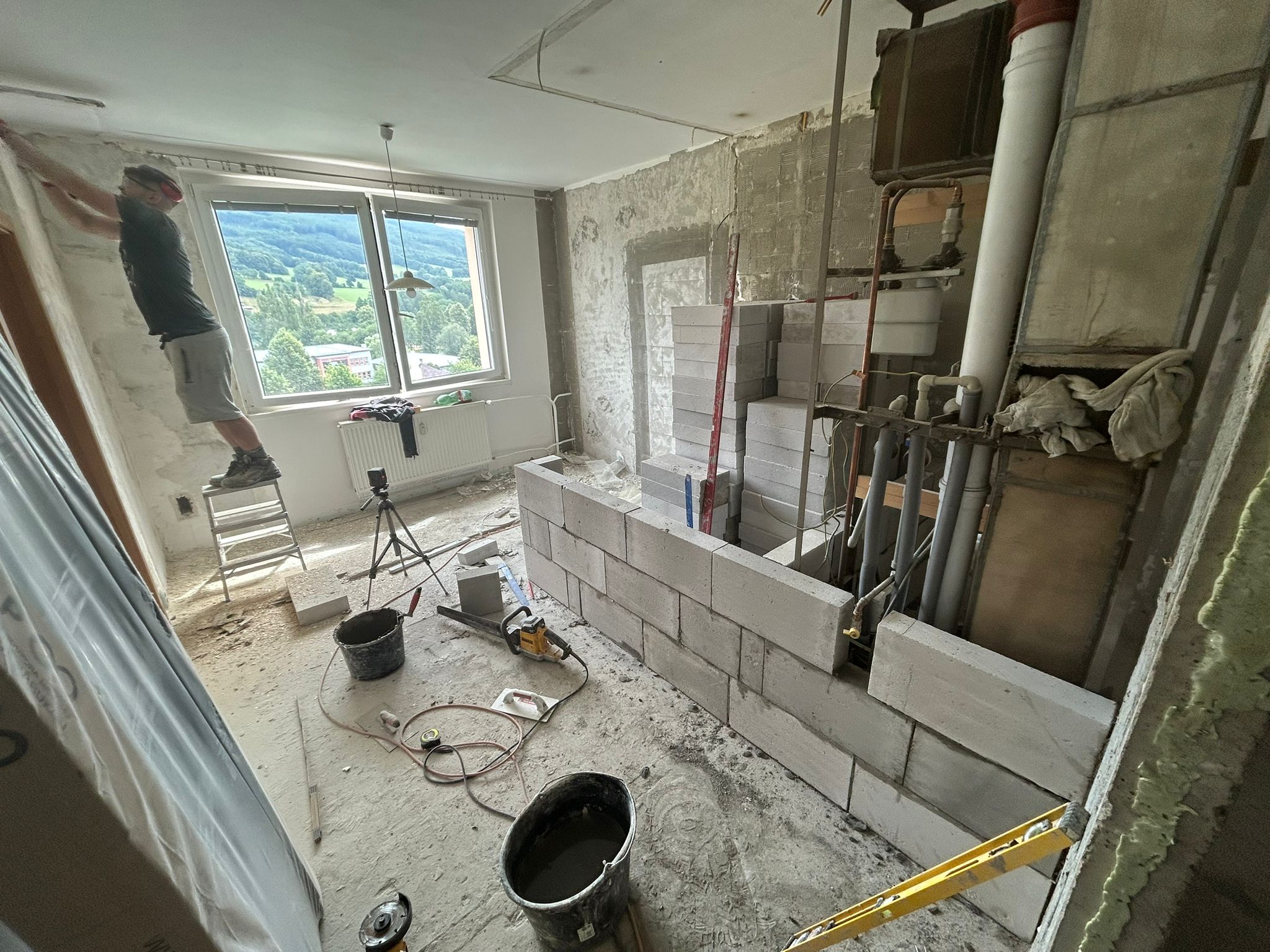 Součástí prací bylo vyzdění nového jádra, rozvody elektroinstalace a vodoinstalace, omítky a obklady s instalací nové sanity.