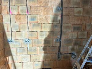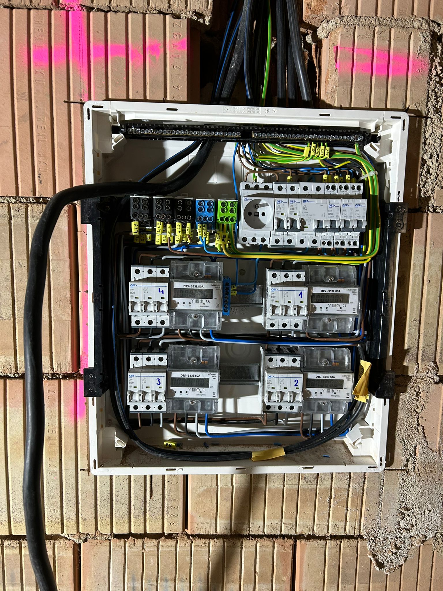 Realizace elektroinstalace ve 4 bytech a společných prostorech. Zasekány kabely, osazeny krabice a připraveny bytové rozvaděče pro zásuvkové i světelné okruhy.