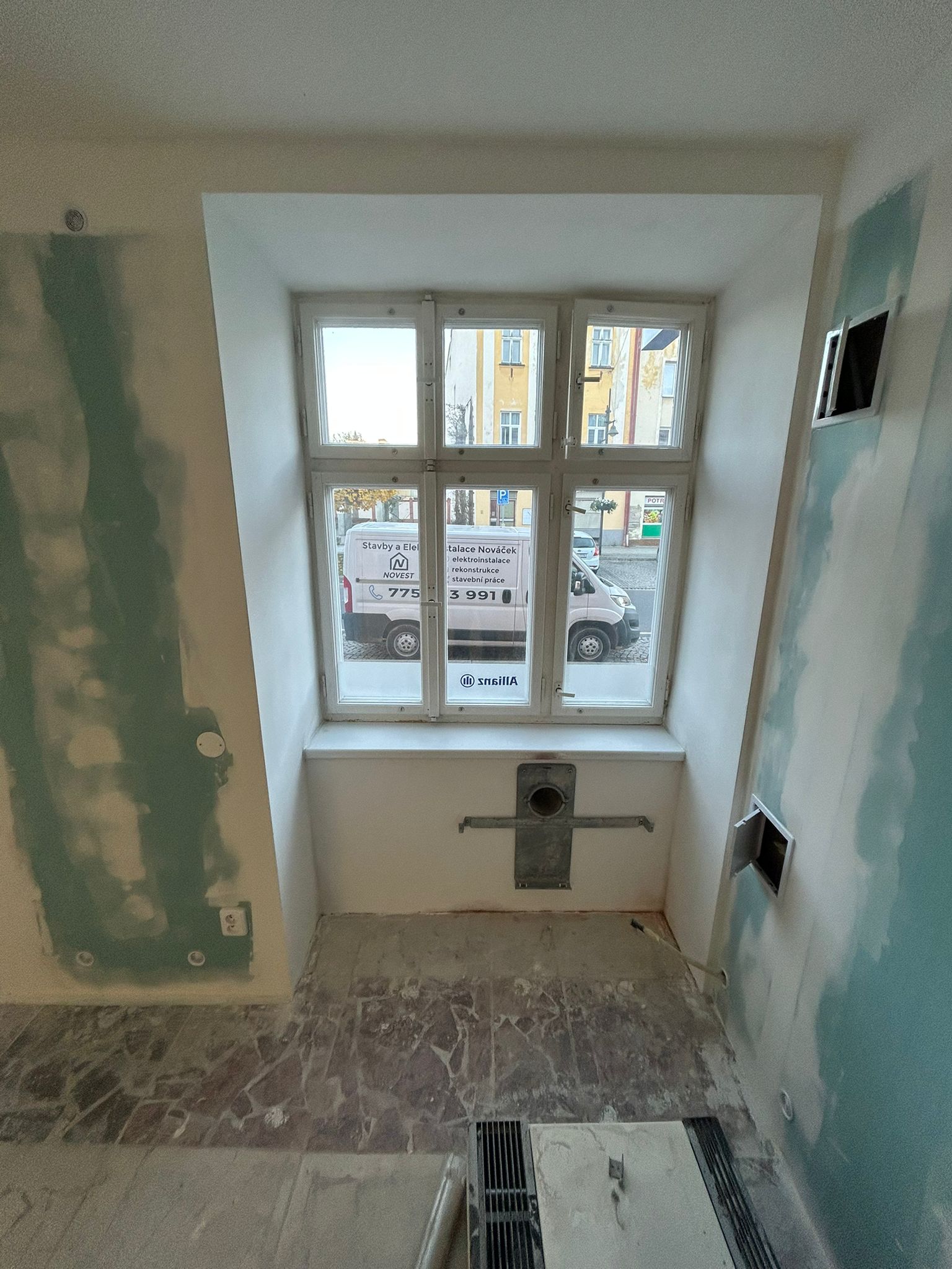 Provedli jsme kompletní rekonstrukci kanceláře, která zahrnovala montáž sádrokartonových konstrukcí a předstěn, vybudování nových příček, přípravu a zapravení instalačních rozvodů, celoplošné tmelení a úpravu stěn. Součástí prací byla také úprava okenních ostění a celková příprava prostoru pro finální povrchy.